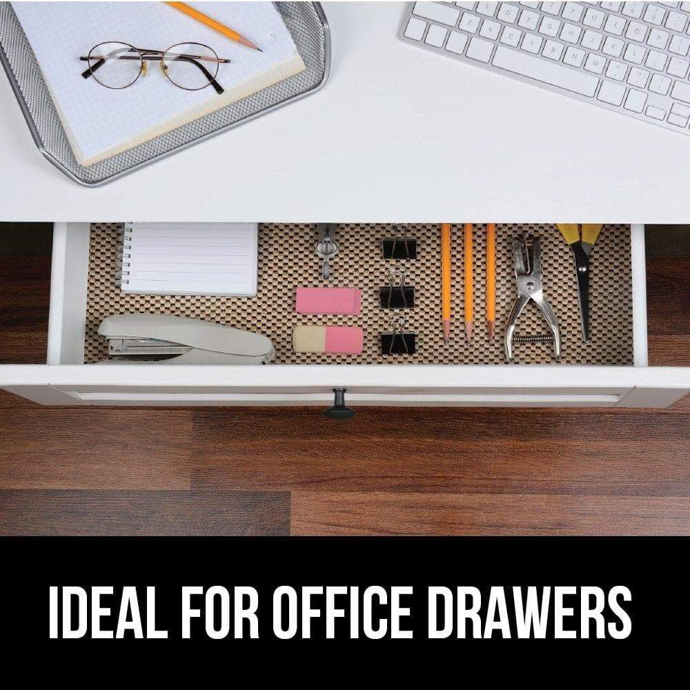 Details: Tired of constantly adjusting your dishware and wiping out messy cabinets and drawers? Your money and time is valuable. Try the GORILLA GRIP DRAWER LINER!! This drawer liner helps keep your dishes, mugs, glassware, and office supplies in place while protecting your cabinets from dirt and debris.