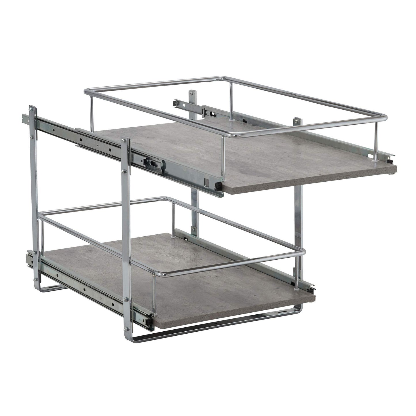 Details: Command all the space in your cabinets with these sliding cabinet organizer shelves. These pull-out shelves make things in the back of your cabinets easy to access. Gone are the days of bending, kneeling or craning to reach things in the back corners of the cabinets. Each shelf can move independently of the other and glides easily to extend fully outside of your cabinet. The organizers are mounted on your cabinets to ensure they stay put even when the shelves are fully extended. This cabinet organizer is made of heavy duty steel chrome wire and sleek faux concrete, elevating the look of any kitchen or bathroom. The concrete shelves are attractive and reduce the risk of items falling through or getting caught on traditional wire shelves and baskets. Whether you use this sliding cabinet organizer to store small appliances, food, pots and pans, cleaning supplies, toiletries or anything else, this organizer will upgrade any cabinet situation. These shelves come ready to install with hardware included.