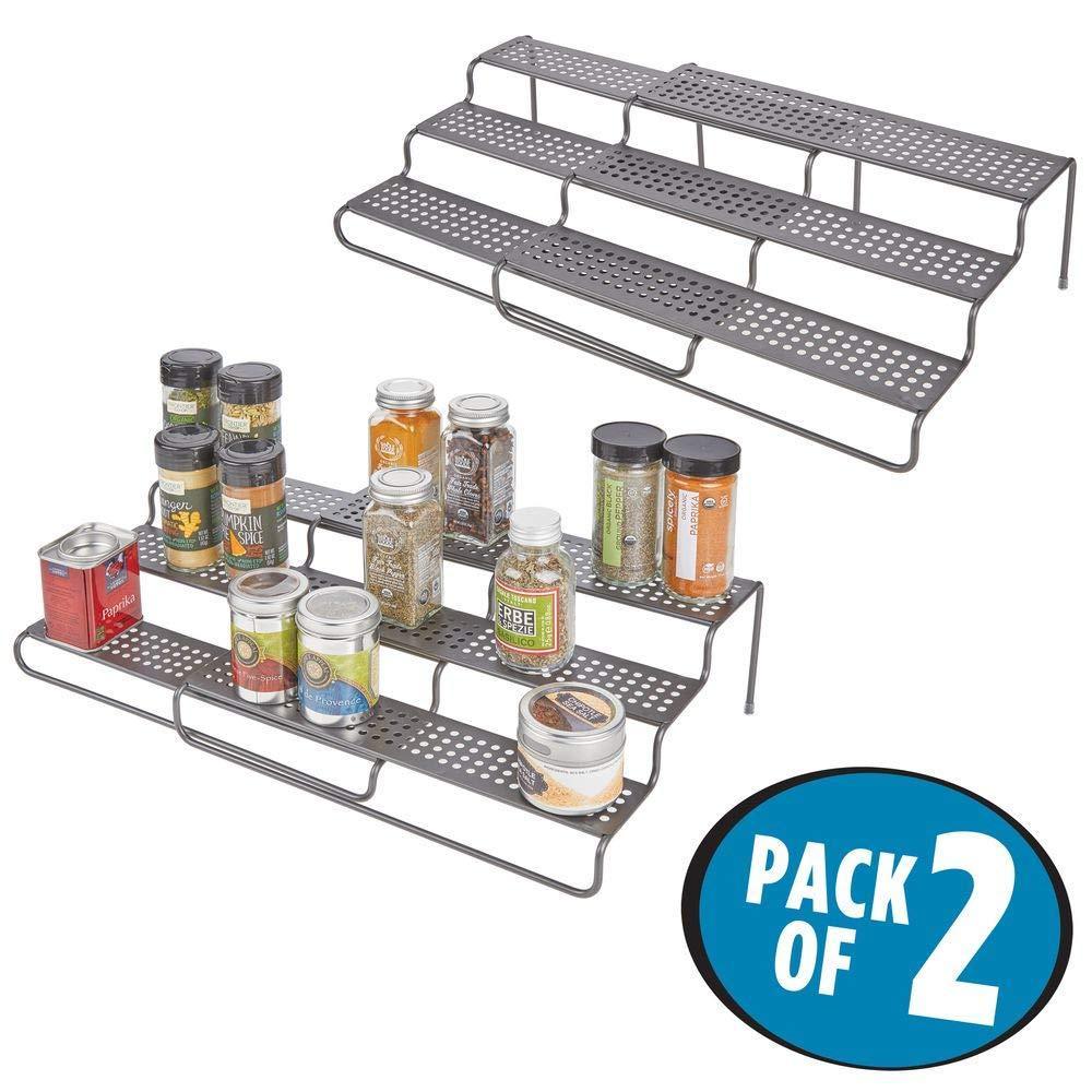 Details: The Expandable Tiered Storage Shelf makes the most of the storage space on your kitchen counter tops or in kitchen cabinets with its customizable design. The tiered design makes it easy to see what's stored on each level and quickly grab what you need. Each shelf keeps spices, canned goods, baking supplies, boxed goods and more in one compact and convenient place. Customize to cabinet and countertop spaces by expanding the shelf for a perfect fit.