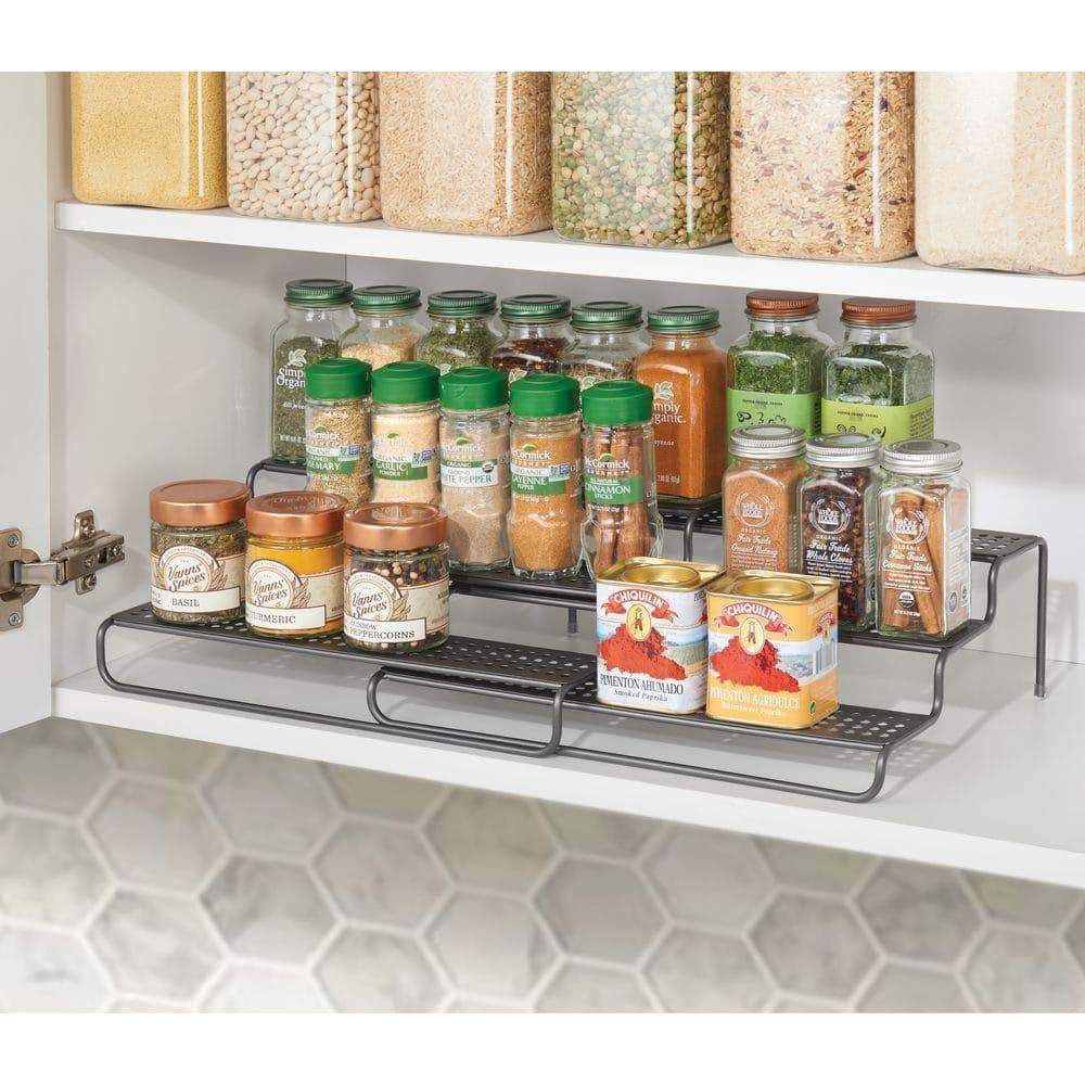 - MAXIMIZE & ORGANIZE YOUR SPACE: Create more space in cluttered kitchen cabinets and pantries with this very functional expandable shelf organizer; Arrange herbs, spices, baking supplies, vitamins, sauces, soups, jelly jars, essential oils, medicine bottles and more; The 3 tiered levels make it easy to locate and quickly grab what you need; Use in homes, apartments, condos, dorm rooms, RVs and campers to fully maximize storage space; Save space in cabinets and cupboards and organize like a pro