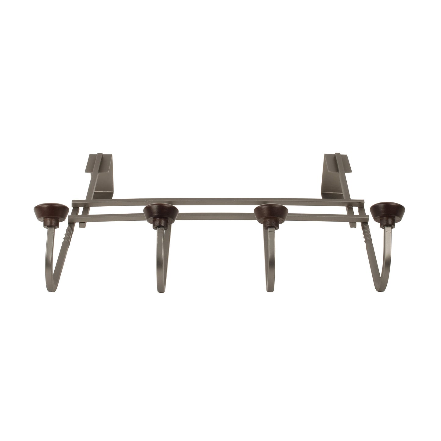 Details: Add storage to any room in your home with the Cambridge over the door 4-hook rack by spectrum. This rack takes advantage of unused space behind any door, creating storage for hats, coats, towels, robes and other accessories. With no tools or installation required, the sturdy steel bracket fits doors up to 1-3/4'' thick.