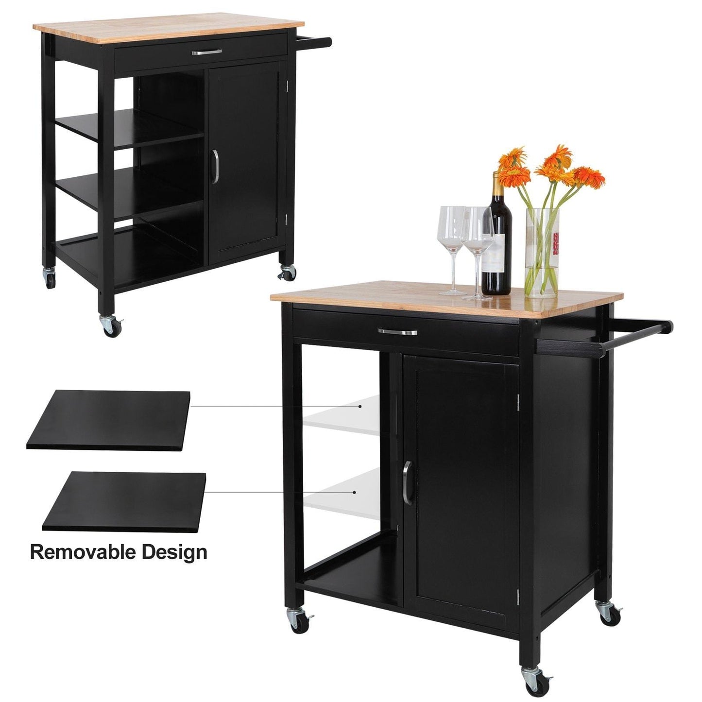 ZENSTYLE 4-Tier Rolling Kitchen Island Utility Wood Trolley Serving Cart Kitchen Storage Cart w/Towel Rack, Rubberwood Butcher Block Countertop, Cabinet, Drawer, Shelves